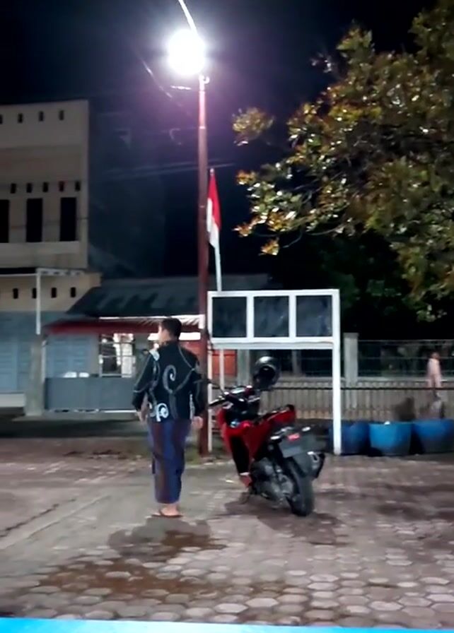 At night, a man is walking in the street. He is wearing a dark-colored jacket with a white design, a blue sarong, and sandals. He walks away from the camera. Behind him are two red motorcycles parked near a white frame. There is a building with barred windows in the background. An Indonesian flag is on a pole next to a streetlight. The ground is wet.