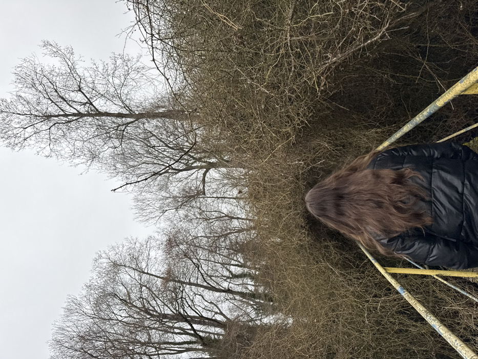 An image taken in Dyuni, Bulgaria, depicts a single individual walking away from the viewer on a narrow structure with yellow handrails. The person, seen from behind, has long, wavy, dark brown hair and wears a black, puffy winter jacket. The structure appears to be a bridge or elevated pathway, showing signs of wear and faded blue paint on the handrails. The path is flanked on both sides by dense, leafless, tangled vegetation forming a thick wall, creating a tunnel-like effect. Beyond the immediate shrubbery, numerous tall, bare deciduous trees with visible branches extend towards an overcast, light grey sky. The scene suggests a cool or cold season due to the absence of leaves on most trees and bushes.