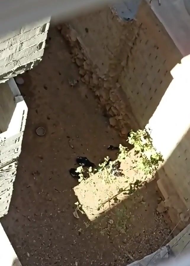 The camera pans down to a small outdoor area. The area is bounded by concrete walls on three sides. There is soil on the ground, with some small plants growing near the bottom right corner of the frame. There is a small, shallow metal dish in the upper left. Several magpies are standing on the ground.