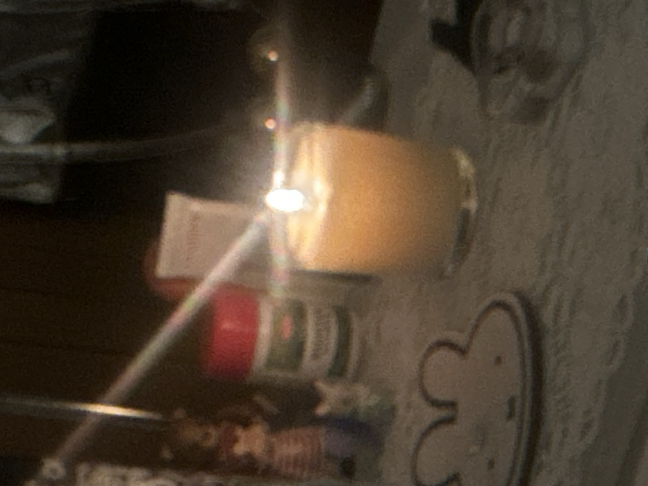 The scene depicts a dimly lit indoor setting within the city of Wealden, United Kingdom, focusing on a collection of objects arranged on a textured, light-colored surface. A lit candle in a clear glass votive holder occupies the central-right foreground, emitting a bright white flame and casting a warm yellow-orange glow. Prominent lens flares originate from the candle flame, diagonally traversing the image. To the left of the candle, on the same surface, a light-colored coaster shaped like a stylized rabbit head with two dark eyes and a small cross-shaped mouth is visible. Behind the coaster and candle, a small decorative figurine with red and white striped clothing stands next to a smaller, light blue animal figurine. Further back and to the right of these figurines, a cylindrical container with a red screw-top lid and a white/green label is present. Behind this container, a small, white, squeezable tube or packet is partially visible. The immediate background is dark and indistinct. In the blurred far-right foreground, a metallic object with circular components, possibly eyeglasses, is partially visible. No individuals are present in the image.