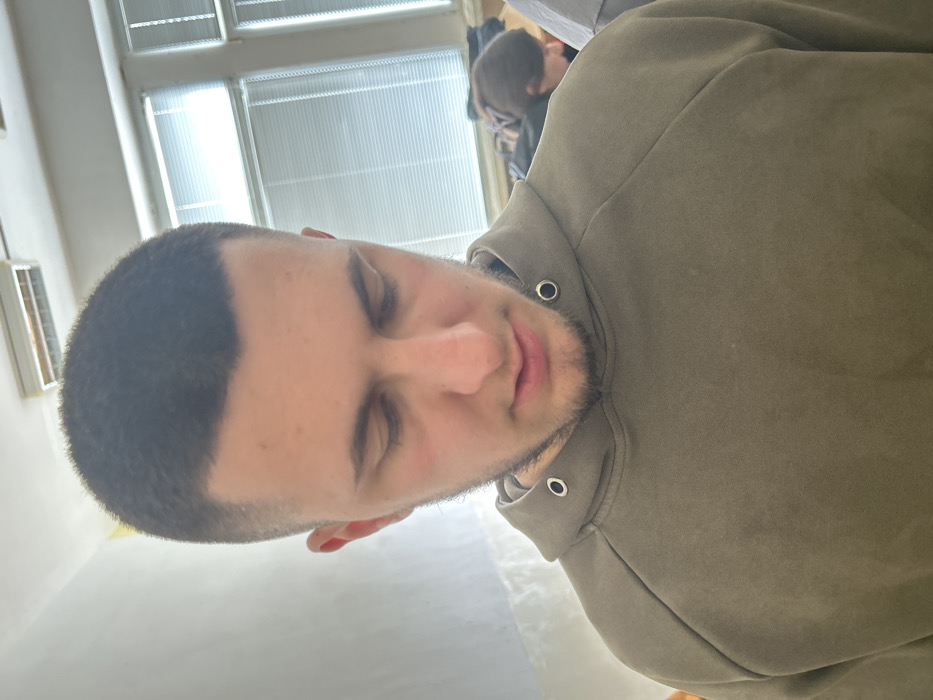 The image captures a young adult male in an indoor setting in Pravets, Bulgaria