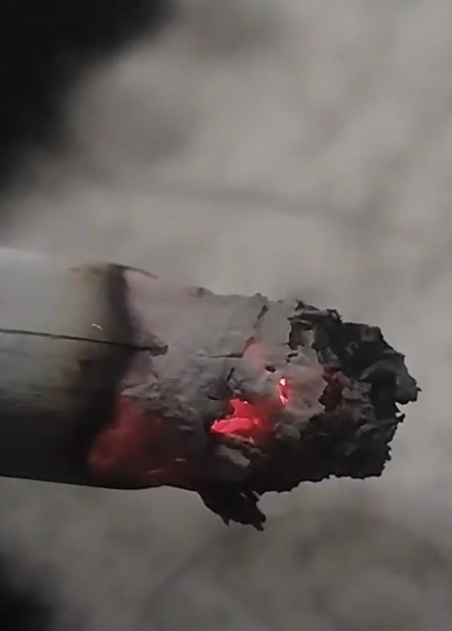 A close-up video shows a lit cigarette burning, with red embers visible and smoke wafting around it