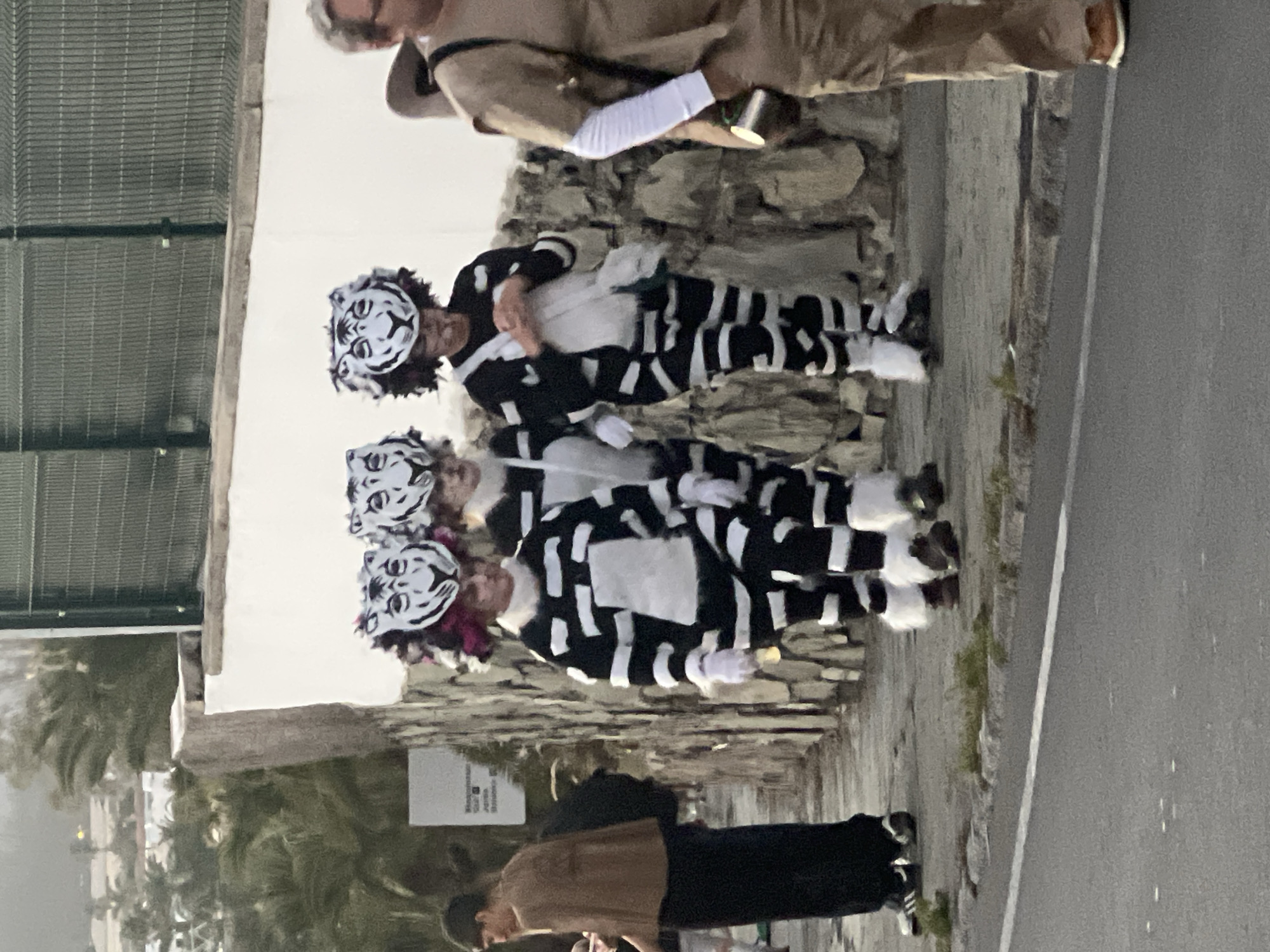 The image, taken in San Bartolomé de Tirajana, Spain, shows four individuals in costume standing on a sidewalk next to a street. They are wearing black and white striped outfits and white tiger masks. An older man is walking in front of them on the sidewalk. The background includes a gray stone wall, a metal fence, and palm trees. The environment suggests a street scene, likely with the costumes for a parade or festival.