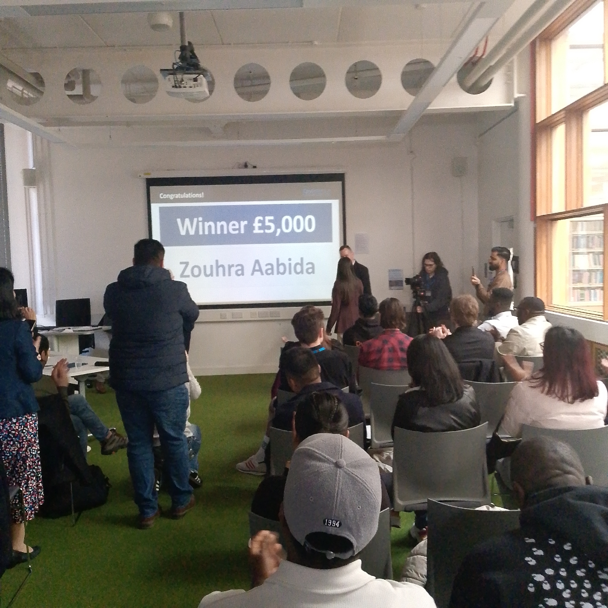 This image captures an indoor event within an educational or presentation space at Coventry University in Coventry, United Kingdom. The scene depicts approximately 20-30 individuals, mostly seated, facing a large projector screen at the front of the room. The screen displays "Congratulations!", "Winner £5,000", and the name "Zouhra Aabida" in white text on a dark blue and white background. A ceiling-mounted projector illuminates the screen. The room features a green artificial turf-like carpet covering the floor. Large, multi-pane wooden-framed windows occupy the right wall, through which bookshelves are partially visible in an adjacent area. The ceiling is white with exposed, perforated I-beams, from which lighting fixtures and the projector are suspended. At the front of the room, near the screen, several individuals are standing. A person in a dark blue puffer jacket and jeans stands with their back to the camera, facing the screen. Another person with dark hair, potentially Zouhra Aabida, stands near the screen, accompanied by a man in a dark suit. To the right, a person operates a professional video camera on a tripod, directed towards the screen area. Adjacent to the camera operator, a bearded man holds a smartphone vertically, pointed towards the screen, appearing to record the event. On the far left, a person wearing a floral skirt and dark top stands, also holding a smartphone, seemingly capturing the scene. The seated audience occupies grey, modern chairs. A person in the immediate foreground, with their back to the camera, wears a grey baseball cap with "1994" embroidered on the rear. Other visible audience members include a person in a black hooded jacket with white speckles on the back, a person in a black leather jacket, and a person in a red and black plaid shirt. Some individuals are seen clapping. Laptops are visible on tables along the left wall.