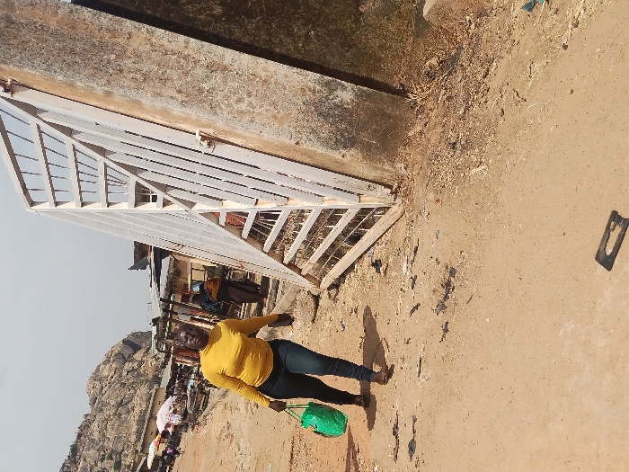 An outdoor scene in New Stadium, Nigeria, depicts an unpaved pathway with a prominent metal gate on the right