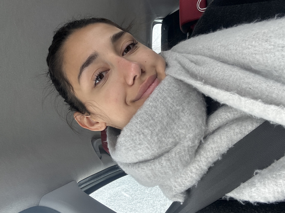 A woman with brown hair pulled back is shown from the chest up, tilted to the left. She wears a light gray, fluffy scarf that wraps around her neck and a black jacket. A seatbelt crosses her torso. The background suggests she is inside a car, with the car's interior visible. Outside the window, snow is seen. Her expression is relaxed and she has a slight smile.