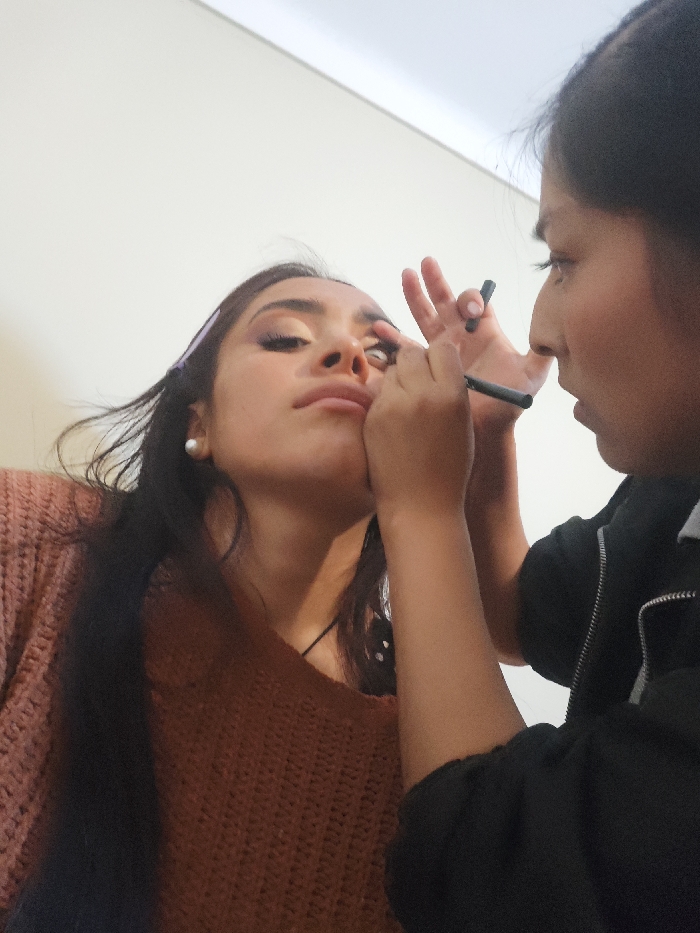 A low-angle shot shows a person applying eyeliner to another person