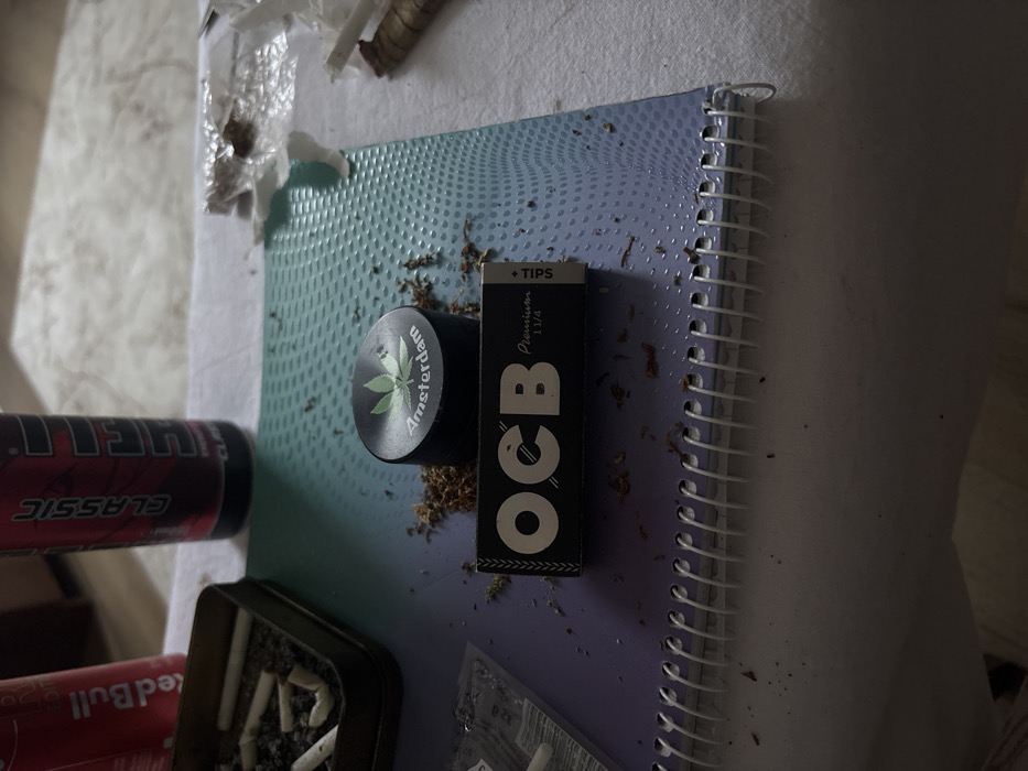 The image displays an indoor tabletop scene in Petrich, Bulgaria. The surface is covered by a light-colored fabric, likely a tablecloth. On the left, a red Red Bull energy drink can is partially visible next to a rectangular, metallic ashtray filled with multiple cigarette butts and ash. A red and black UFI Classic energy drink can stands further to the right. In the center, an open spiral-bound notebook with a light blue textured cover is positioned, upon which a quantity of dried, shredded brown leafy plant material, consistent with tobacco or cannabis, is scattered. A black cylindrical grinder, featuring a light green cannabis leaf logo and "Amsterdam" text, rests on the notebook amidst this material. Adjacent to the grinder is a black packet of OCB Premium 1 1/4 + TIPS rolling papers. In the upper right portion of the image, a hand-rolled item, possibly a cigarette or joint, is visible alongside a small piece of crumpled white paper or foil containing additional plant residue. The arrangement suggests the preparation or recent use of smoking materials.
