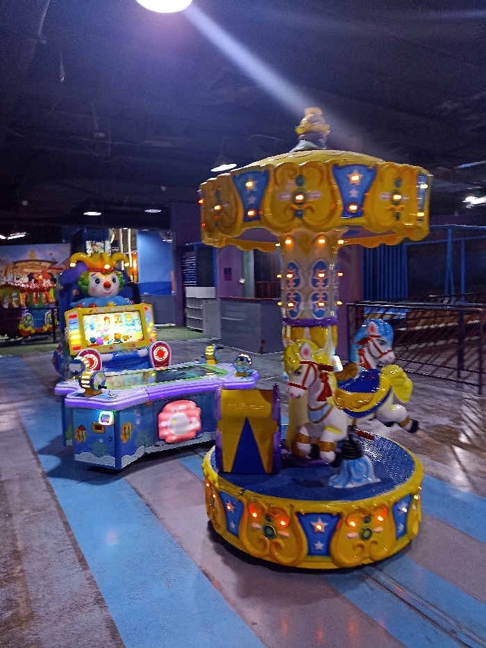 This image captures an indoor entertainment center in the Kafr Sousa Municipality, Syria. The scene features multiple amusement rides and arcade games, primarily illuminated by the colorful lights of the machines and overhead fixtures. In the foreground, a small carousel ride with a yellow and blue design is visible. It features two white horses adorned with blue saddles and yellow elements, and its canopy and base are decorated with illuminated star patterns and circular lights. Directly behind the carousel, a larger arcade game stands prominent. This game includes a large clown figure on top, wearing a multi-colored jester hat. Below the clown is a wide display screen showing animated characters, and a central play area containing water with small floating objects, illuminated by purple and white lights. To the left and further back, another brightly colored amusement ride is partially visible. The flooring throughout the visible area consists of alternating strips of light gray and blue material. In the background, various structural elements include pale purple walls or partitions, light gray counters, and a blue ribbed barrier on the right side of the frame. The ceiling is dark and industrial, with exposed ducts or beams, and a strong, bright beam of white light emanates from an overhead fixture on the upper right. No individuals are present in the image, and all rides and games appear stationary.
