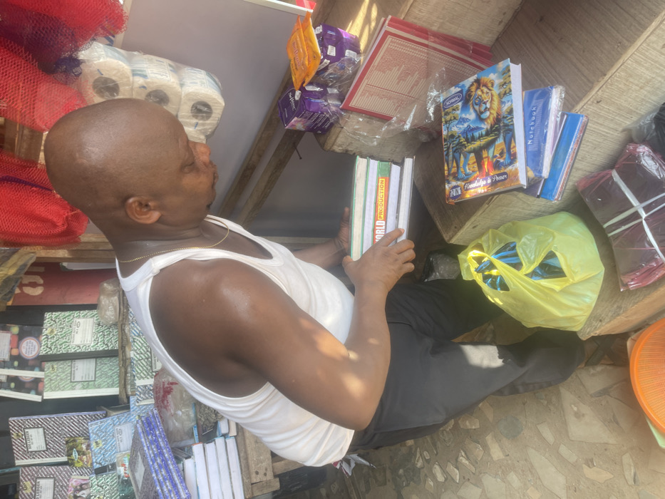 The image depicts an adult male, bald and dark-skinned, wearing a white sleeveless undershirt and dark trousers, standing within what appears to be a market stall in Umunekwu, Nigeria. He is observed from the mid-torso up, bending slightly forward and looking down. His hands are holding a stack of four books or large notebooks; the visible spine of one book reads "WORLD PRODUCTION." To his immediate right, on a wooden surface, are several other stationery items, including a notebook with a colorful lion graphic cover, and a stack of smaller notebooks labeled "Notebook." Further right, packaged sanitary pads or similar products in purple and orange wrappers are stacked on another wooden surface. Rolls of toilet paper in plastic packaging are suspended behind these items. Above and to the left of the man, numerous ledgers and notebooks, some labeled "BIG LEDGER," are displayed on wooden shelving. Red mesh bags are also visible hanging in the background. At the man's feet, a bright yellow plastic bag sits on a paved or tiled ground. The scene is brightly lit, suggesting an outdoor or semi-outdoor setting.