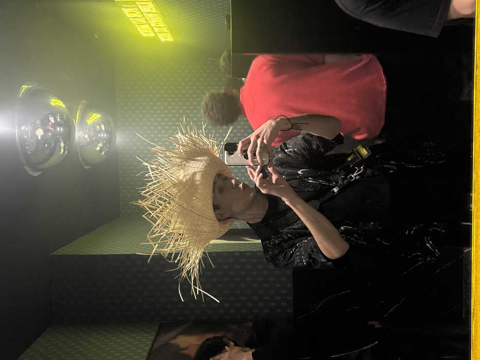 The image depicts an indoor scene in San Bernardino Tlaxcalancingo, Mexico, featuring three individuals reflected in a mirror. A central male subject wears a large, frayed straw hat, a black short-sleeved shirt with white patterns over a black t-shirt, and a black shoulder bag with a yellow pouch. He holds a light-cased smartphone with both hands to capture the reflection, his lips slightly pursed. To his right, a second male subject is reflected from the back, wearing a plain red t-shirt. A third individual, partially visible on the far left, wears dark clothing and has their hand near their head. The environment features dark walls with a subtle dot pattern, a dark ceiling with two reflective dome-shaped fixtures, and a yellow neon light sign on the right wall. A dark counter surface and a yellow reflective strip are visible at the bottom edge of the mirror.