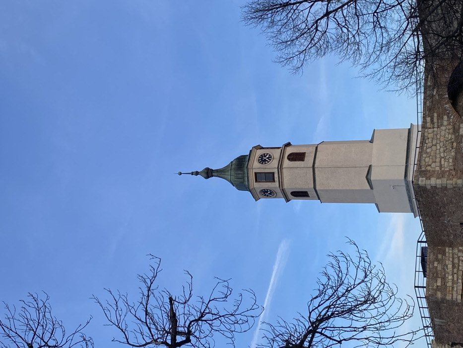 A tall, light-colored clock tower stands against a bright blue sky. The tower is multi-tiered, topped with a green dome and spire. Each side of the upper tier has a clock face. Bare tree branches frame the bottom and top corners of the image. Part of a brick wall is visible on the right side of the tower. A vapor trail cuts through the blue sky.