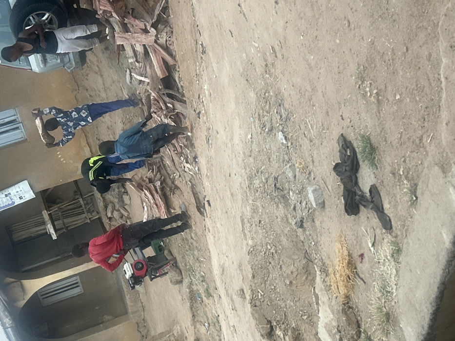 Five people stand around what appears to be debris or materials on the ground. A person in red operates a piece of machinery. To the right, dark-colored clothes are crumpled on the dirt. A vehicle is visible to the left of the top individual. A building facade with windows and signage forms a backdrop. The scene seems to be outdoors.