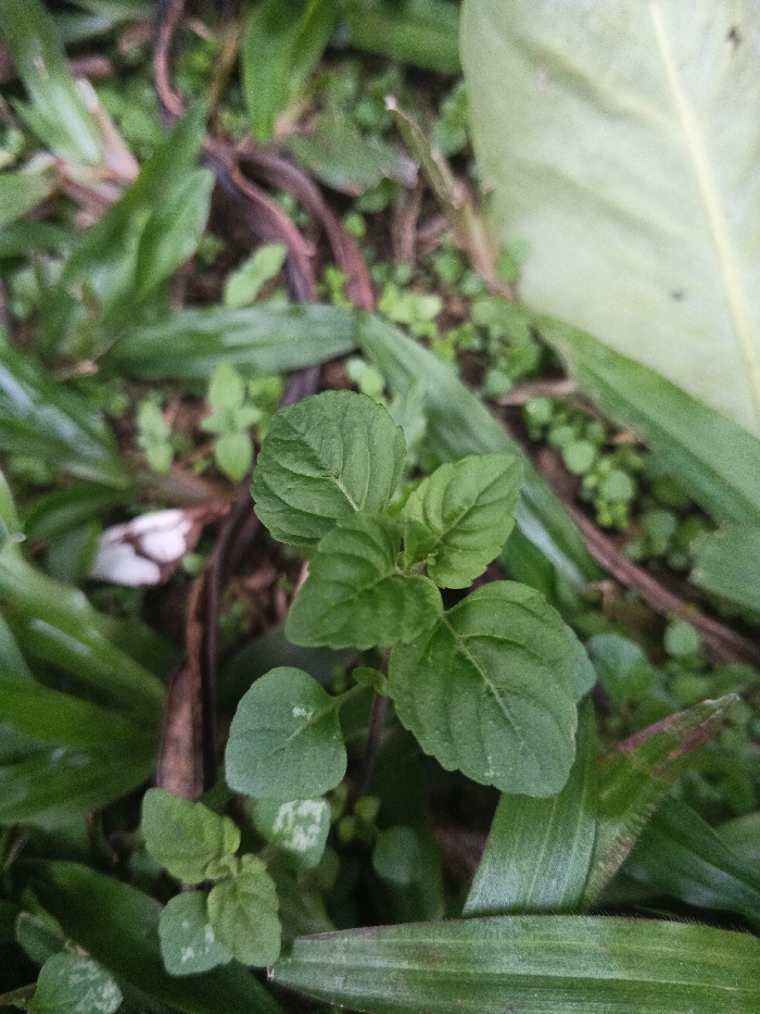A downward-angle, shallow-depth-of-field photograph depicts a small, healthy green plant with approximately six primary ovate, serrated leaves at its central growth point, located slightly off-center left in the mid-foreground. The leaves exhibit prominent venation. The plant is rooted in dark, visible soil, surrounded by a dense ground layer of varying green vegetation, including longer grass blades, smaller broadleaf plants, and scattered fragments of dried, reddish-brown plant matter. The background is softly blurred, showing additional green foliage and dark ground, consistent with an outdoor natural environment. No human or animal subjects are present. The location is Ciherang, Indonesia.