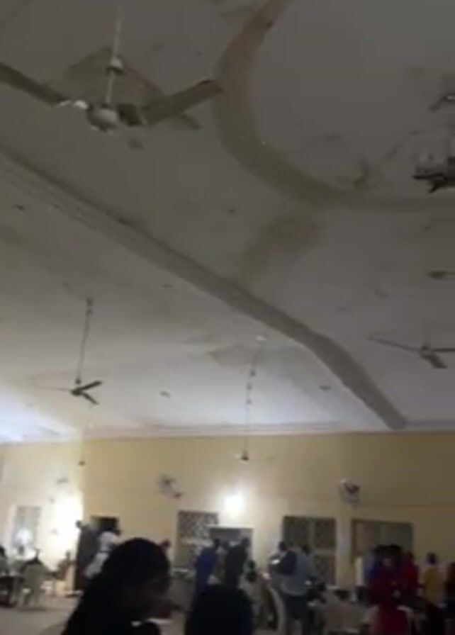 A large indoor room with a high ceiling. The ceiling is white with peeling paint and multiple ceiling fans. Some fans are on, while others are off. There is a circular design in the center of the ceiling, and a chandelier hangs from it. The room is brightly lit. Many people are milling about, mostly standing in groups. Some people are sitting in plastic chairs. The walls are light yellow. Windows with metal grates are present on the walls. A man in a t-shirt and hat puts his hat on his head.