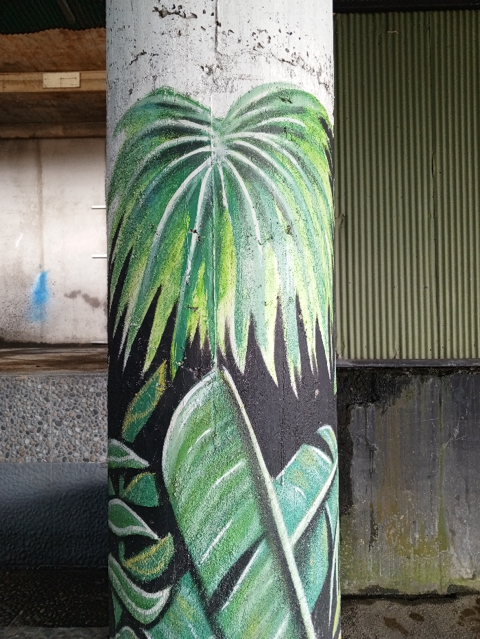 - "A concrete pillar is adorned with a vibrant tropical leaf mural" by FM-oEwZy2, licensed under CC BY 4.0
