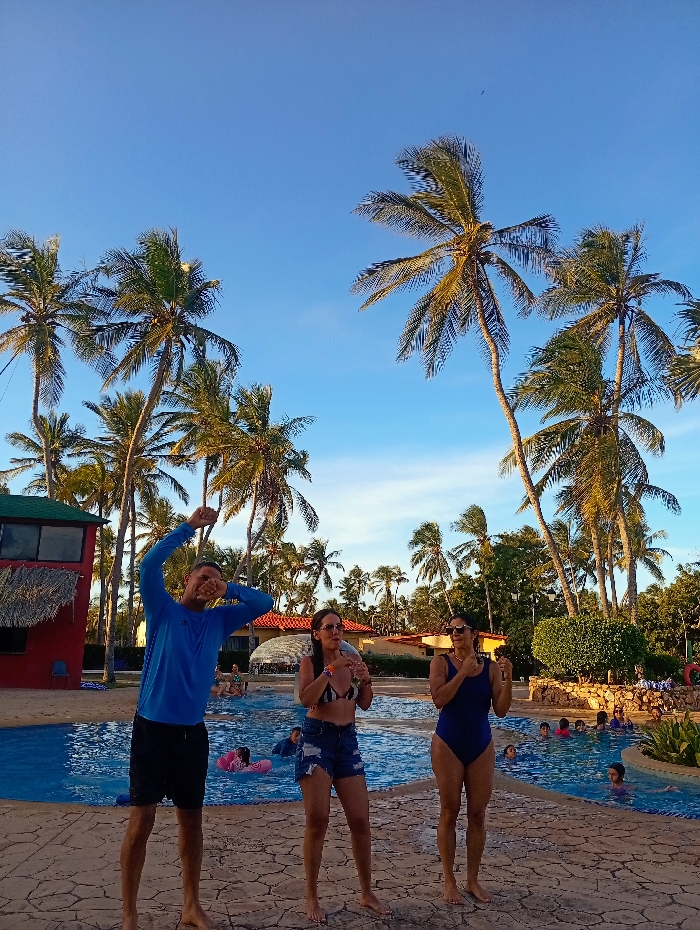 The image depicts a tropical outdoor scene at a resort in Playa El Agua, Venezuela, under a clear blue sky. In the foreground, three individuals stand barefoot on a light-colored, patterned paved surface adjacent to a swimming pool. The person on the left is a male, wearing a blue long-sleeved rash guard and black swim shorts, with his arms raised in a "shaka" or celebratory gesture, mouth open. The central figure is a female, wearing a striped bikini top and blue denim cut-off shorts, holding a clear object, possibly a glass or bottle, in her right hand, with her mouth slightly open. To her right stands another female in a dark blue one-piece swimsuit, also holding a clear object in her right hand and another object in her left hand near her chest, with her mouth slightly open. In the midground, an irregularly shaped swimming pool with blue water contains multiple individuals, including adults and children, some utilizing flotation devices such as a pink inflatable ring. To the left of the pool, a two-story building is visible, featuring a red lower section and a darker upper section with windows and a small thatched accent roof. Further in the midground and background, numerous tall palm trees with green fronds are prominent, under direct sunlight, indicating a bright day. Behind the pool on the right, additional resort structures with orange tiled roofs and extensive green foliage are visible, including what appears to be a thatched-roof cabana or structure. The overall lighting suggests late afternoon or early morning due due to the warm illumination.