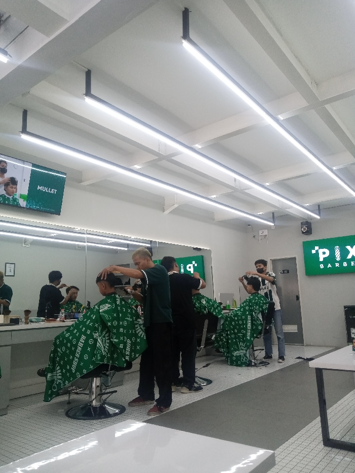 The image displays the interior of a modern barbershop named 'PIX BARBER SHOP' in Sindanglaya, Indonesia