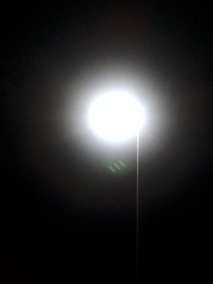 The scene, observed in Ankpa, Nigeria, depicts a single, prominent artificial light source against a dark, featureless background, indicating nighttime conditions. A bright, circular light is centrally positioned, emitting a strong, diffuse glow. A slender, vertical pole extends downward from the light source's lower edge, consistent with a street lamp structure. Green, dashed horizontal artifacts, characteristic of lens flare, are visible to the lower right of the primary light. No individuals, buildings, or discernible ground features are visible within the frame due to the darkness and the intensity of the light source.