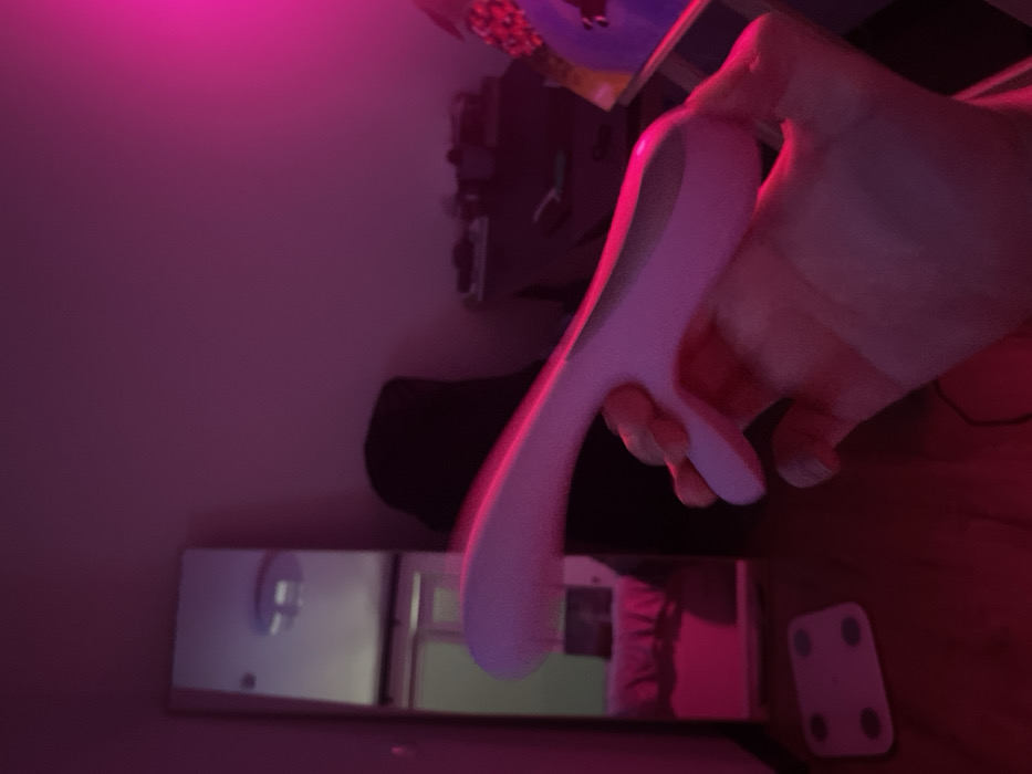 A blurred image shows a hand holding a white, Y-shaped object, possibly a sex toy, against a backdrop with a dark object and a mirror reflecting a person in red clothing. A white, electronic device with rounded squares is on the table. The scene is bathed in red and pink light, creating an intimate or suggestive atmosphere.