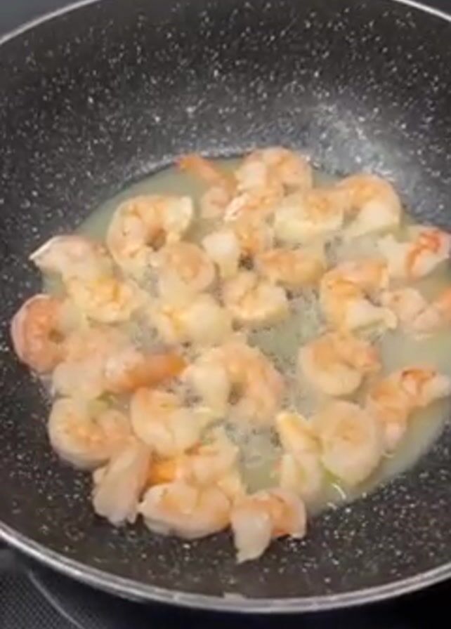 pan filled with shrimp being cooked in a light, bubbly liquid