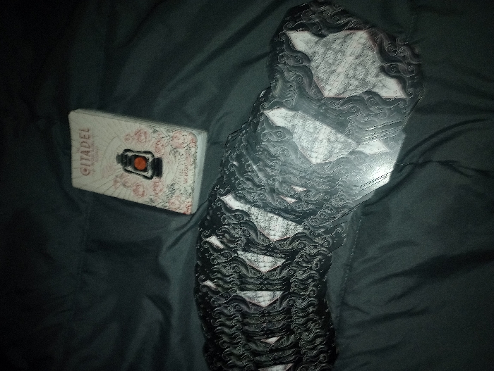 The image displays a close-up, dimly lit view of game components resting on a dark, wrinkled fabric surface, possibly a bedspread or blanket. In the upper right, a rectangular box, likely for a game, is visible, titled "CITADEL." The box features an illustration of a vintage-style lantern with an orange glow, surrounded by faint floral patterns on a light, possibly cream or white, background. To the lower left, a fan of approximately 20-30 uniquely shaped game cards is spread out. Each card possesses a dark, intricate border with swirling patterns, framing a lighter, textured central design. The cards overlap sequentially. No individuals are present. The setting is indoors, with no discernible features indicating a specific location within Los Angeles, California, United States of America.