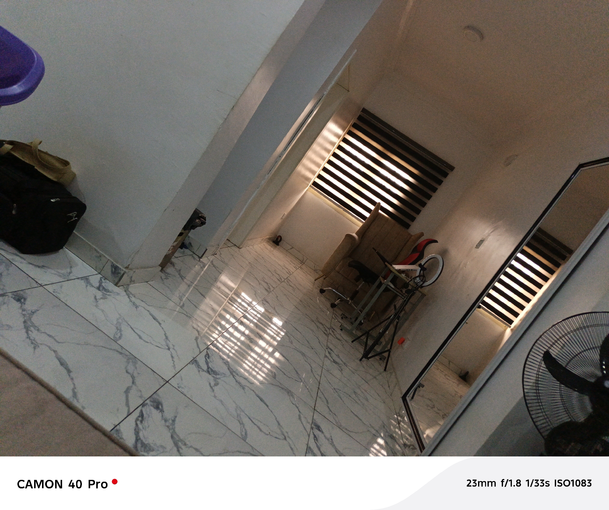 A room in Lekki, Nigeria, featuring tiled floors, a window with closed blinds casting striped shadows, a desk and chair set near the window, a tall mirror reflecting the window, and a fan beside the mirror. A bag and a purple container are near the wall in the foreground.