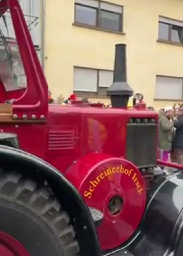 vintage red tractor with "Schreinerhof Irsch" written on the wheel