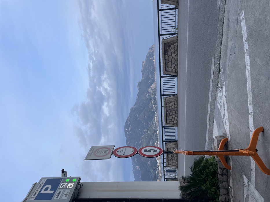 This image depicts a roadside scene in Pogerola, Italy, at what appears to be an overlook