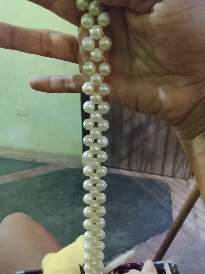 The scene depicts a vertical strand of numerous uniformly sized, spherical, cream-colored pearls, meticulously strung in a braided or double-helix pattern. A light-skinned hand holds the upper portion of the pearl strand between the thumb and forefinger; the thumb's fingernail is visible and unpolished. Below the pearls and to the left, a portion of a light-skinned leg, possibly a thigh, is visible, partially covered by a bright yellow fabric. The immediate background to the upper left features a plain light green wall with a white electrical outlet or switch plate. The floor, visible below and to the left, displays a geometric pattern in shades of green and blue. The background to the right is blurred, showing vertical dark brown elements, possibly wood, and indistinct multi-colored objects in the lower right. The image is situated in Altagracia, Venezuela.