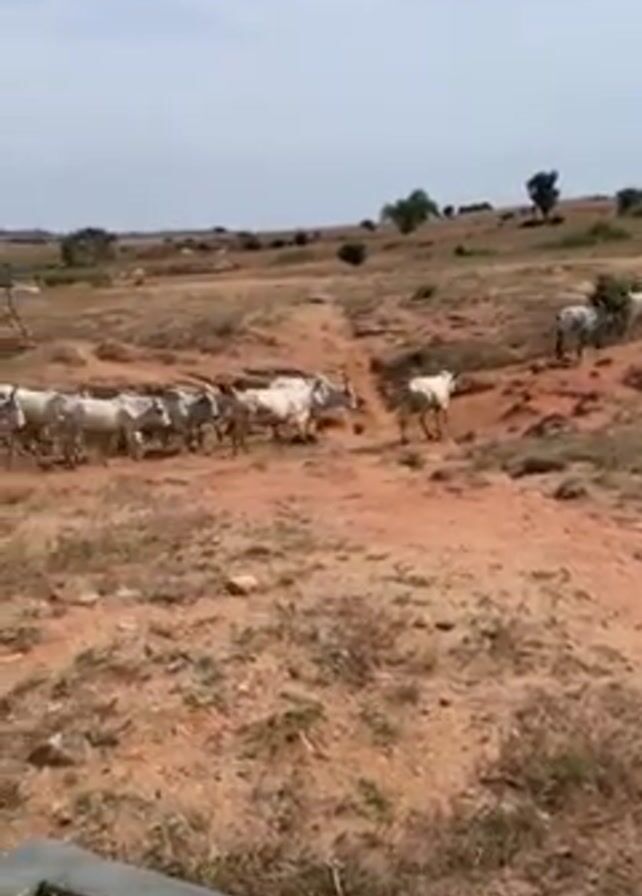 A herd of white cattle is walking through a dry, red dirt landscape dotted with sparse trees and bushes under a bright, slightly cloudy sky. The camera angle is slightly elevated, positioned near a low, gray wall-like structure. As the herd moves, an elderly man wearing a pink robe and a patterned white and blue cap walks into view, standing near the wall and looking at the cattle. The scene suggests a rural or agricultural setting in a warm climate.