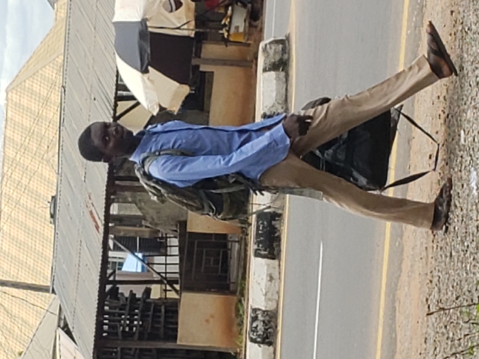 This image depicts a male individual walking on the unpaved shoulder of a paved road in Adankolo, Nigeria