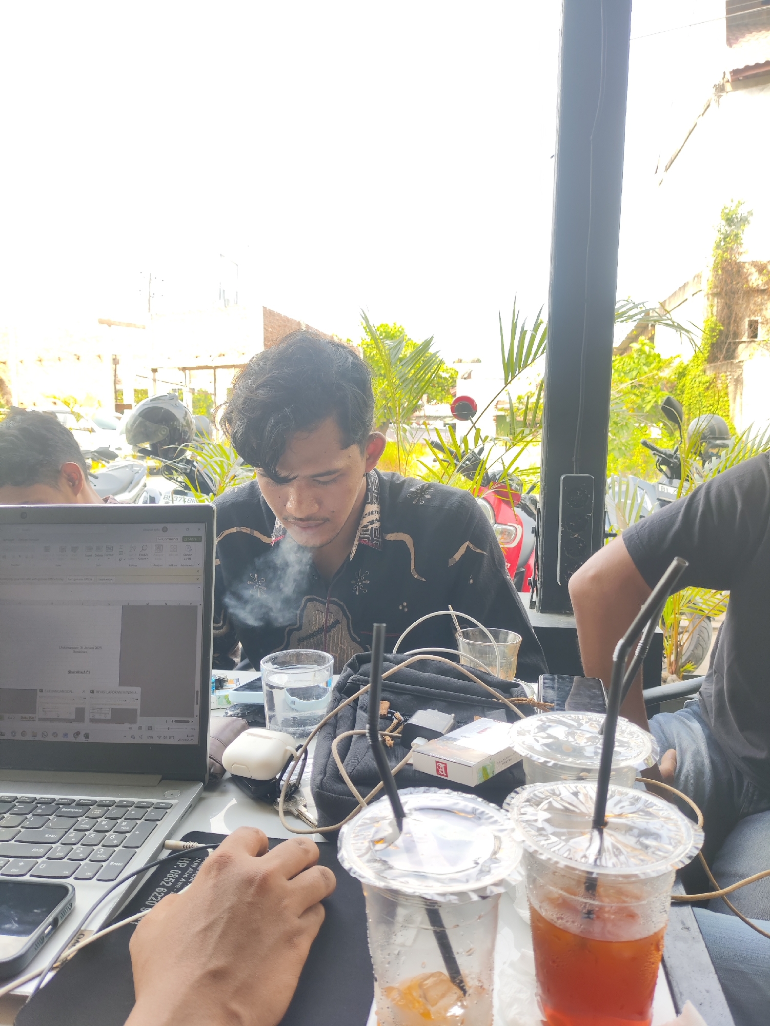 The image depicts an outdoor or semi-outdoor seating area at a café in Lhokseumawe, Indonesia, during daytime. Three individuals are present. In the center-right, a young adult male with dark hair, wearing a dark long-sleeve shirt with light patterns, is seated at a table. He is looking down and exhaling a cloud of smoke from his mouth. A clear glass of water is directly in front of him. To the left, a partial view of another individual's head and dark hair is visible, seated in front of a silver laptop. A human hand, positioned on a black mousepad, operates a computer mouse connected to the laptop. The laptop screen displays a document or spreadsheet, with text including "Laporan Mingguan" and a date "31 Januari 2024." A dark mobile phone is partially visible near the laptop. To the far right, a partial view of a third individual's torso and arm, wearing a dark t-shirt, is visible. On the white table, multiple objects are arranged: a pack of "AROMA" cigarettes, a white earbud case, keys on a ring, and three plastic cups with clear lids and black straws. One cup is nearly empty with ice, another contains a reddish-brown liquid approximately half full, and a third, mostly empty, is behind them. The background shows an outdoor environment with lush green foliage, including palm fronds. Several motorcycles, including a red scooter and others with helmets, are parked. A partially visible license plate "BL37XX BR" is present on one motorcycle, consistent with Indonesian registration from Aceh province. Buildings with light-colored facades are visible beyond the foliage and motorcycles. A dark vertical beam or column, on which a speaker is mounted, separates the interior from the exterior view.