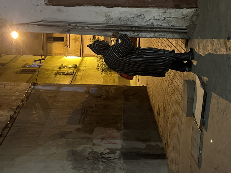 An evening scene depicts a narrow urban alleyway in Casablanca, Morocco. A lone individual, dressed in a striped, hooded djellaba, dark trousers, and dark shoes, stands on the right side of the frame, facing right and leaning into a doorway or opening. A red shoulder bag hangs from their left shoulder. Their right hand appears to be interacting with the doorframe. The ground consists of patterned paving stones on the right and smoother concrete with two metal utility covers and a displaced concrete slab on the left. The left wall of the alley is aged and textured, exhibiting peeling paint, faded graffiti, including outlines of two faces, a stylized flower symbol, and red script. Buildings in the background are illuminated with warm yellow light, revealing multiple stories and windows. A prominent red star symbol is visible on a yellow wall in the deeper background. A single, bright, warm yellow streetlamp is visible overhead, casting long shadows across the alley. Green foliage is visible below a window in the background.