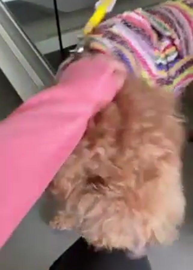 A person wearing black pants and a pink long-sleeved shirt pets a tan poodle in a hallway. The poodle is wearing a colorful sweater and a yellow leash. The person pets the poodle on its head and back. The hallway has light gray walls and a staircase on the left side of the frame. The audio includes unintelligible speech.
