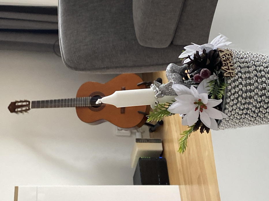 The scene is an indoor domestic environment located in Täby, Sweden. In the foreground, a decorative centerpiece rests on a light-colored surface, possibly a table. This centerpiece consists of a cylindrical container densely covered with small, silver spherical beads. Centrally placed within the container is a white, tapered, unlit candle with a visible wick. Surrounding the candle are various artificial Christmas-themed decorations: white flowers resembling poinsettias with red-green centers, green pine needles, small pine cones, and clusters of red berries. A small, silver-glittered figurine of a deer or reindeer stands beside the candle, which is encircled by a string of silver beads at its base. A small, light-brown wooden cutout reading "Merry Xmas" is attached to the side of the beaded container. In the midground, a light-brown acoustic guitar is positioned vertically on a black stand, leaning against a plain white wall. To the left of the guitar, two electronic devices are visible on the light-colored wooden floor: a dark rectangular unit and a lighter-toned, elongated rectangular unit. The right side of the midground is occupied by a section of a gray upholstered armchair or sofa. The background consists primarily of the white wall, with a faint shadow cast to the right of the guitar and a dark curtain partially visible in the upper right corner. No people are present, and no actions or interactions are depicted. The lighting is ambient.