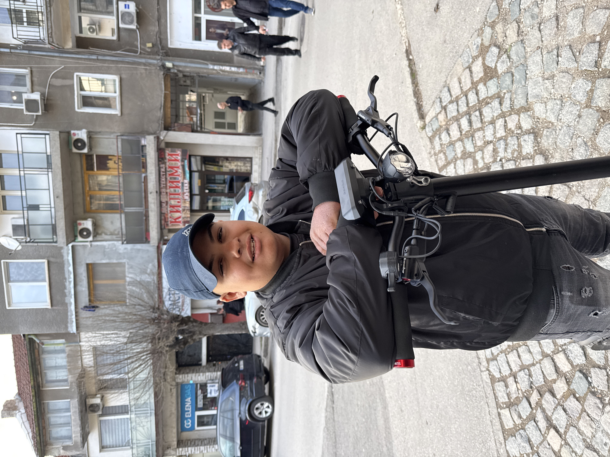 A male individual stands in the foreground, slightly right of center, looking towards the camera. He wears a dark blue baseball cap, a black zippered bomber jacket, and distressed dark grey jeans. His forearms are crossed and rest on the handlebars of a black electric scooter, positioned vertically in front of him. The scooter's handlebars display a gray control panel, a black brake lever, a front headlight, and red end caps. The scene depicts an urban street in Vratsa, Bulgaria. The ground beneath the subject is composed of grey cobblestones, transitioning to asphalt beyond. In the mid-ground, a dark blue BMW X5 SUV is parked on the left side of the street. Behind the vehicle and extending to the right are multi-story buildings of varying facades. One building on the left has a white facade with white window frames and a blue and white sign displaying "GC ELENAGAS" in Cyrillic script. A bare deciduous tree stands in front of this building. Adjacent and further right are grey-plastered buildings featuring balconies and multiple external air conditioning units. One building displays a prominent red sign with "КИЛИМИ" (Kilimi - Rugs) written in white Cyrillic text. In the background, four additional male figures are visible. One individual in a dark jacket walks away from the camera on the left sidewalk. Further down the street on the right, two men in dark jackets walk towards the camera, while another man in dark clothing walks away. The sky is overcast, providing diffused daylight.