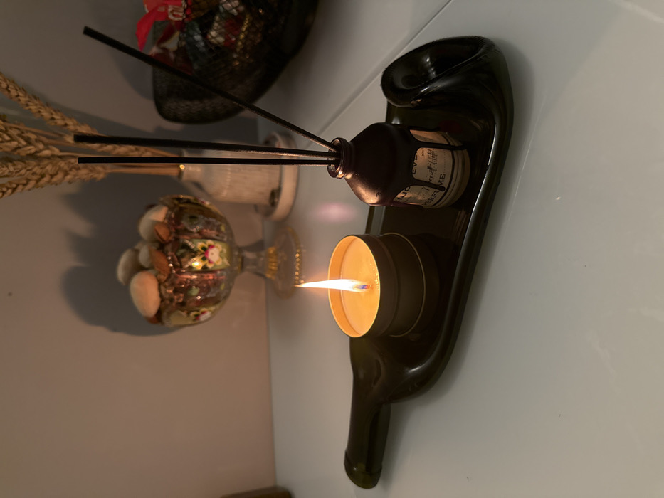 The scene displays an indoor still life arranged on a white, reflective surface, with a plain light grey wall as the background. A dark green, flattened glass wine bottle functions as a tray, holding a lit yellow candle in a round, metallic tin. Adjacent to the candle is a dark brown bottle, marked "PERFUME" on a label, acting as a reed diffuser with several black reeds fanning upwards. The diffuser bottle has a textured, dripped dark substance coating its exterior. The flattened bottle tray terminates on the right with an upward-curving section, resembling the neck of the original bottle. In the mid-ground, a decorative, footed glass bowl with intricate colorful patterns contains light-colored stones and almonds, casting a shadow on the wall. Behind this bowl, a slender, light-colored vase holds dried wheat stalks. Further to the right, a dark, possibly woven basket contains various colorful objects. No people are present. The location is Unknown, Unknown.