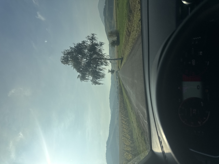 The image provides a driver's perspective from inside a vehicle, looking forward along a paved road leading towards the distant town of Epfig, France. In the immediate foreground, the top section of a black steering wheel and a partially visible digital dashboard with illuminated readouts (including numerical values such as "70" and "+50") are present. The road, appearing to be a single lane in each direction, extends into the midground. To the left of the road, a vineyard with trellised rows of grapevines, displaying autumnal yellowish-green foliage, parallels the thoroughfare. Beyond the vineyard, the cluster of buildings composing Epfig is discernible, featuring what appears to be a prominent church spire amidst other structures. To the right of the road, a strip of grassy terrain leads to a prominent, tall deciduous tree with light-colored bark and drooping branches, likely a birch. Further along the road on the right, a smaller, thinner tree stands. The background consists of rolling hills or low mountains on both sides of the distant road. The sky is bright and hazy, with the sun positioned in the upper left, causing a distinct lens flare. Sparse, faint clouds are visible. No people or animals are explicitly depicted.