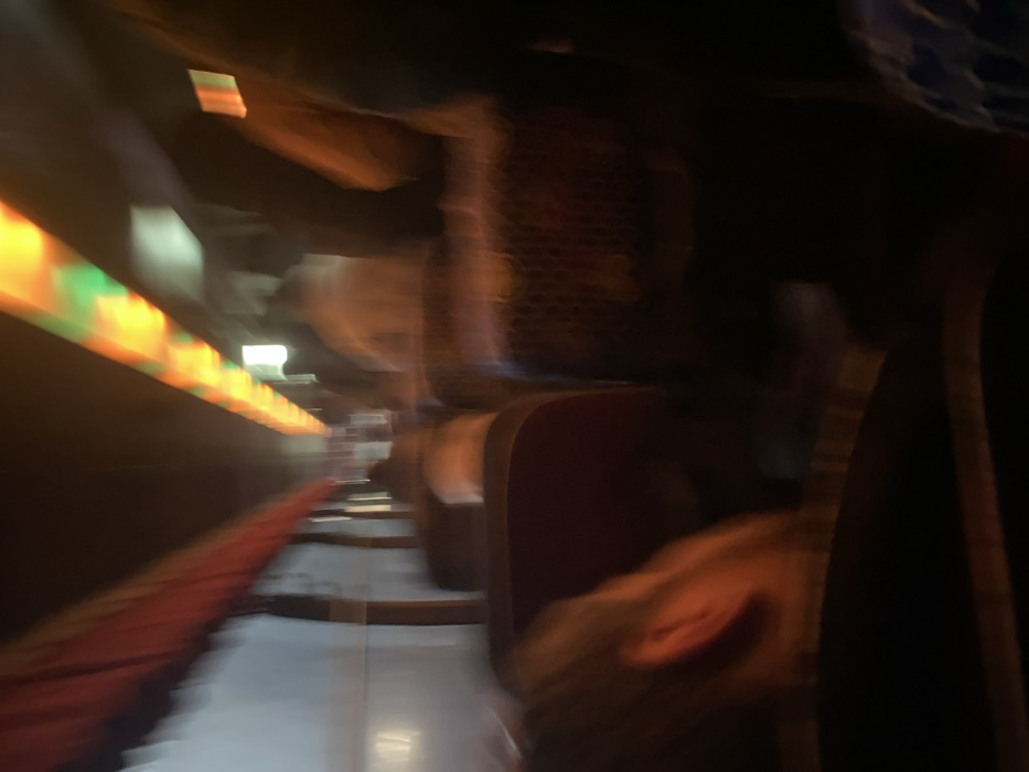 This image depicts the interior of a public transport vehicle, likely a bus or trolleybus, in motion within the city of Oktyabrskiy, Russia, under low light conditions. The perspective is from a seated position, looking forward down an aisle. **Environment:** The vehicle's interior is dark with significant motion blur, indicating movement. Overhead, a continuous strip of illuminated panels emits orange/yellow and green light, creating a distinct ceiling glow. A red or maroon fabric-covered railing or trim runs along the upper left side of the interior. Windows on the left side of the vehicle show indistinct exterior light. **Objects:** Rows of seating are visible. The seatbacks are upholstered in a dark, possibly maroon or red, fabric. The back of a seat in the mid-ground features a patterned or mesh-like covering. **People:** Multiple blurred human figures are discernible, occupying seats within the vehicle. Their specific features are indistinguishable due to the blur and lack of light. In the immediate foreground, to the left, the side profile of a person's head, including a visible ear, is present. This individual appears to have light-colored hair and is wearing dark clothing, facing away from the camera. No discernible actions or interactions between individuals are visible.