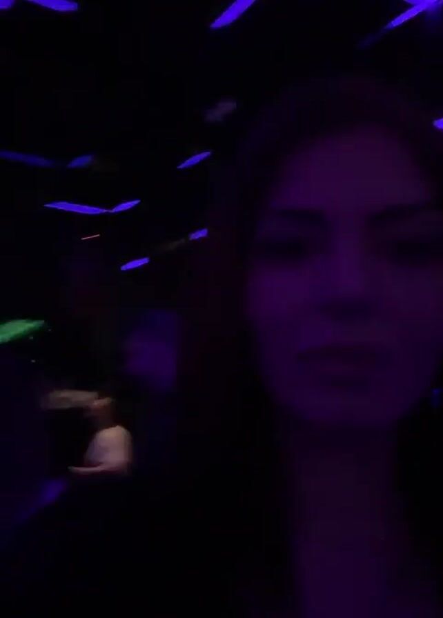 A woman films herself in a crowded, dark nightclub. She is the primary focus, with her face well-lit by flashing lights. Various people move in the background, including one man visible to her left. The room is illuminated by an array of colorful lights.