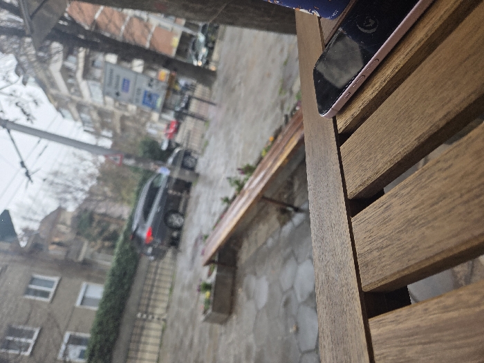 - "The image presents an outdoor urban scene from a low vantage point, focused on a slatted wooden tabletop in the foreground" by FM-xNdDw2, licensed under CC BY 4.0