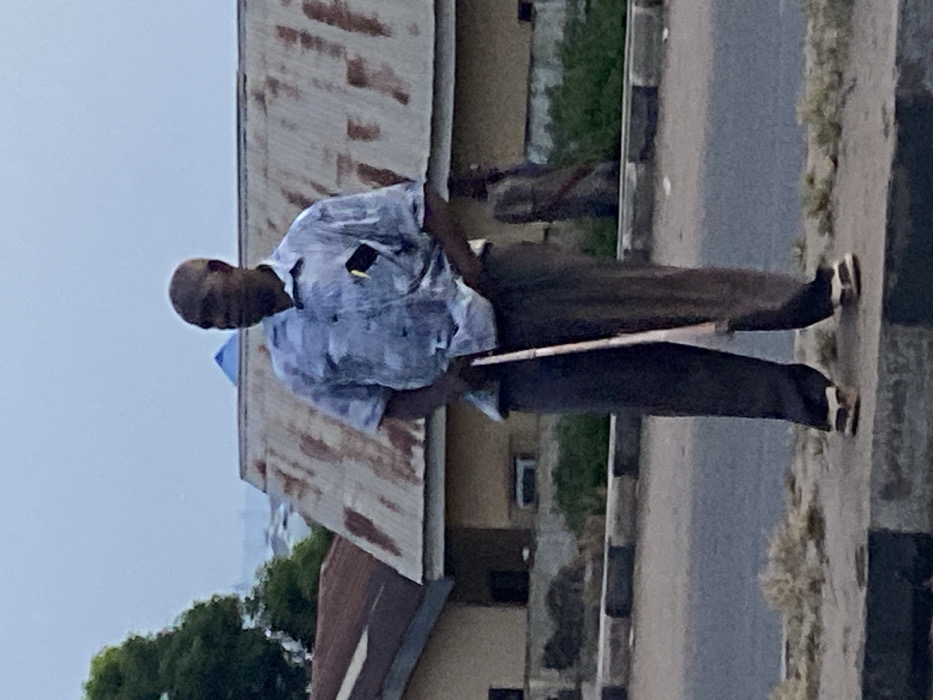 A male individual stands on a concrete curb adjacent to a paved road in Lokoja, Nigeria. He possesses a shaved head and wears a short-sleeved, light-colored collared shirt with a subtle pattern, dark trousers, and light-colored flip-flops. A yellow writing implement is clipped into the left chest pocket of his shirt. He holds a slender, light-brown stick or cane vertically in front of him, with its lower end resting on the ground. His posture is upright, and his head is turned towards the right side of the frame, indicating his gaze is directed in that direction. The curb where the man stands is marked with black and white painted stripes. Immediately behind him are multiple low-rise structures. A prominent building features a large, corrugated metal roof exhibiting significant rust and weathering. To the left, another building with a darker roof is partially visible. Green foliage from trees is present on the far left. A blurred, dark figure of a second individual is faintly discernible in the mid-ground, positioned near the wall of the main building, appearing to be seated or crouched. The sky is a pale blue-grey, indicating diffused daylight. A distant blue conical object is visible on the horizon.