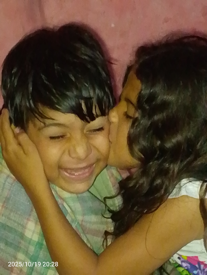 The image depicts two young individuals in an indoor setting against a muted reddish-pink wall. On the left, a male child with dark, straight hair, wearing a light-colored plaid shirt, is seen with closed eyes and a wide, open-mouthed smile. A female child with long, dark, wavy hair, wearing a white top with a colorful pattern visible on the lower right, is positioned on the right. She is kissing the male child's left cheek, with her right hand gently placed on his cheek. Her eyes are also closed. The timestamp 2025/10/19 20:28 is visible in the lower-left corner. The location is in the city of Unknown, Unknown.