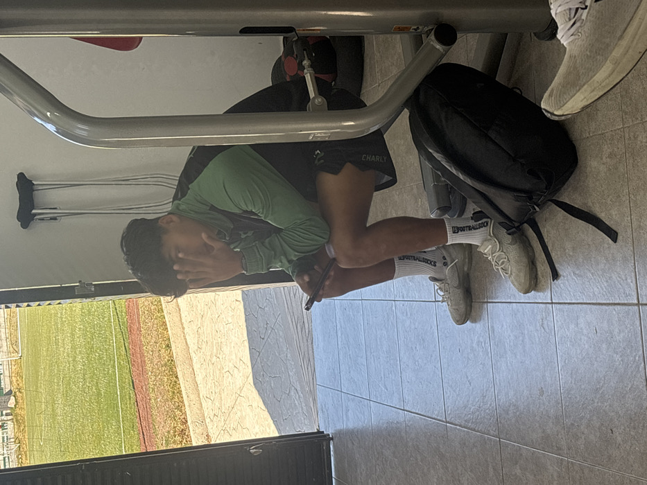 A person sits partially hidden under a treadmill. They wear a green long-sleeve shirt, dark shorts, and white athletic socks with "FOOTBALLSOCCER" printed on them. The person is holding a mobile phone. They are sitting on a tiled floor next to a black backpack. A sports field is visible in the background through an open doorway or window.
