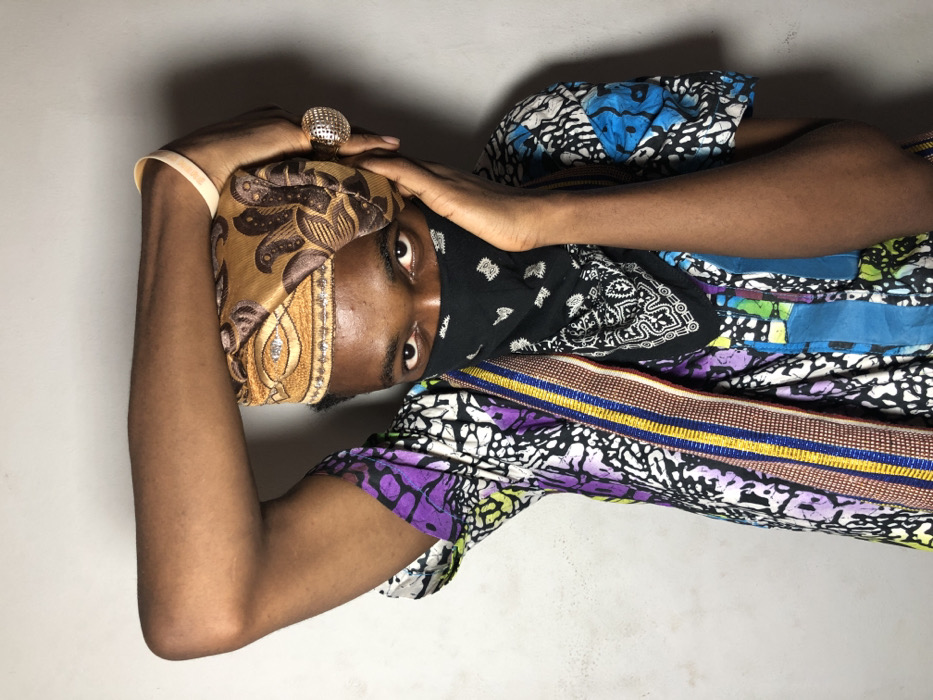 A person with dark skin is depicted from the upper torso upwards against a plain, light-colored wall in Ngleshi Amanfro, Ghana. The individual wears a multi-colored short-sleeved garment featuring purple, white, black, light green, and blue patterns, with a vertical striped fabric band of yellow, blue, and brown on the left side. A tan headwrap with darker brown patterns and light-colored embellishments covers the head. A black bandana with white patterns obscures the lower face. The person's right arm is raised, with the hand near the headwrap, displaying a plain light-colored bangle on the wrist and a large, circular, ornate, light-toned ring on the ring finger. The left hand is positioned near the left cheek/bandana. The eyes are visible and directed towards the viewer.