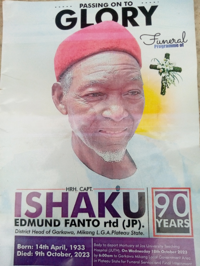 The image displays a printed funeral program. The central subject is a headshot of an elderly man, identified as HRH. CAPT. ISHAKU EDMUND FANTO rtd (JP), smiling faintly, wearing a red cap and a white shirt, with a white beard and mustache. Text at the top reads "PASSING ON TO GLORY" and "Funeral Programme of". To the right of the man's head, a green floral cross with white flowers is visible. Beneath the portrait, the text details: "HRH. CAPT. ISHAKU EDMUND FANTO rtd (JP)", who was the "District Head of Garkawa, Mikang L.G.A. Plateau State." A "90 YEARS" graphic is present next to his name. Further details indicate he was "Born: 14th April, 1933" and "Died: 9th October, 2023." The program states the "Body to depart Mortuary at Jos University Teaching Hospital (JUTH), On Wednesday 18th October 2023 by 6:00am to Garkawa Mikang Local Government Area in Plateau State for Funeral Service and Final Internment." The overall environment is a document, likely a funeral announcement, with slight creases visible, implying it is a physical paper document. The city of Gaklang is not mentioned in the document.