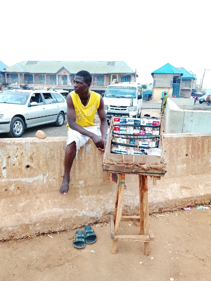 A young man in a yellow tank top and white shorts sits barefoot on a concrete barrier next to a makeshift wooden stand. The stand displays an assortment of cigarette packs. His sandals rest on the ground near the stand's base. A silver car and a white van are parked behind him. Buildings are visible in the background, and a man in a green outfit stands near a concrete structure to the right. The scene appears to be an outdoor market or street vending setup.