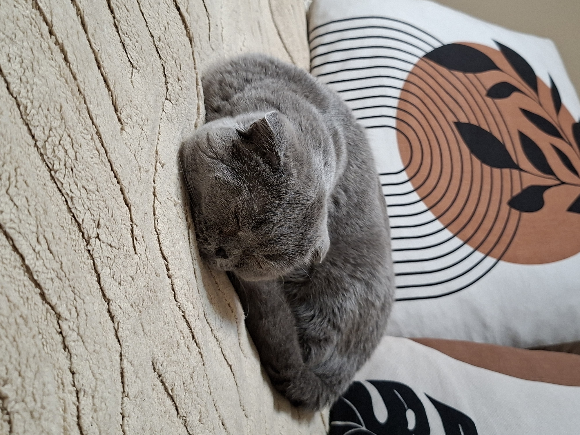 A gray, shorthaired cat is curled up asleep on a beige blanket. The cat is positioned near a pillow with a modern design. The design features black stripes, an orange semicircle, and black leaf patterns on a white background. The photo was taken indoors. There is no indication as to if this photo was taken in Nova Zagora, Bulgaria.