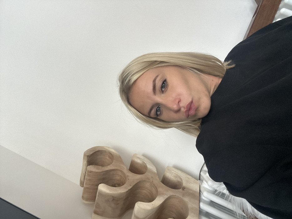 The image displays an indoor scene featuring a single blonde woman posing for a selfie. The woman, appearing to be an adult with shoulder-length, straight blonde hair and light complexion, is positioned slightly off-center to the right, facing directly towards the camera. Her head is tilted minimally to her left, and her lips are pursed in a "kiss" or "pout" expression. She is wearing a loose-fitting black garment, likely a sweater or top. In the background, to the left of the woman, a light-colored wooden wine rack is visible. This rack is designed with a wavy, organic, multi-tiered structure, appearing capable of holding several bottles horizontally. Below the wine rack, a white, multi-finned radiator is partially visible. The wall behind the woman and the objects is plain white, with a subtle angle in the upper left corner, suggesting a sloped ceiling or architectural detail. A dark wooden edge, possibly part of furniture, is partially visible in the lower right corner. The specific location within the city of Limone Piemonte, Italy, cannot be determined from the visual information provided in the image. The setting appears to be a residential interior or a hotel room.